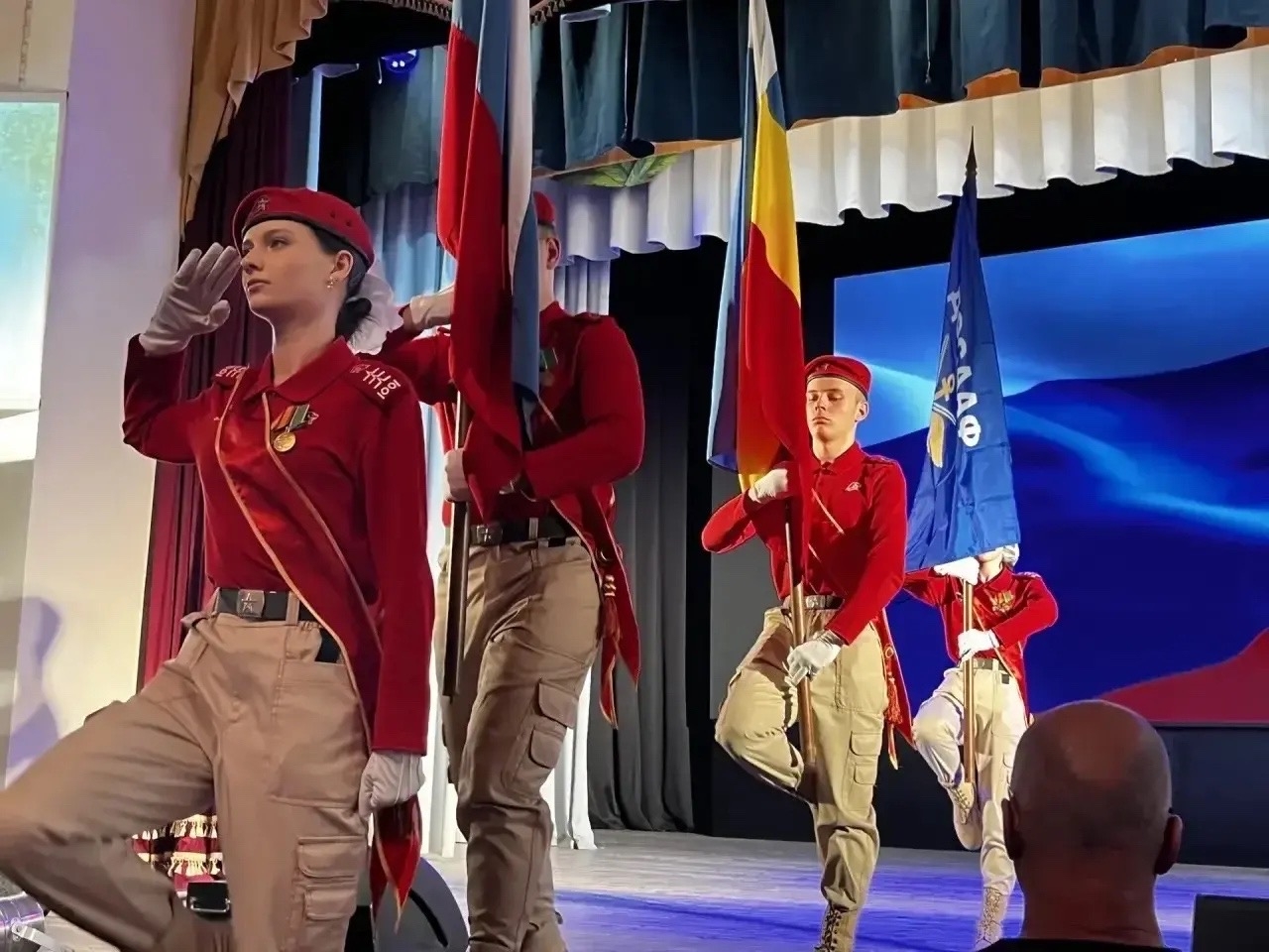 Кульминацией мероприятия стало выступление юнармейцев-знаменосцев, исполнение Государственного гимна РФ и торжественный вынос флагов.