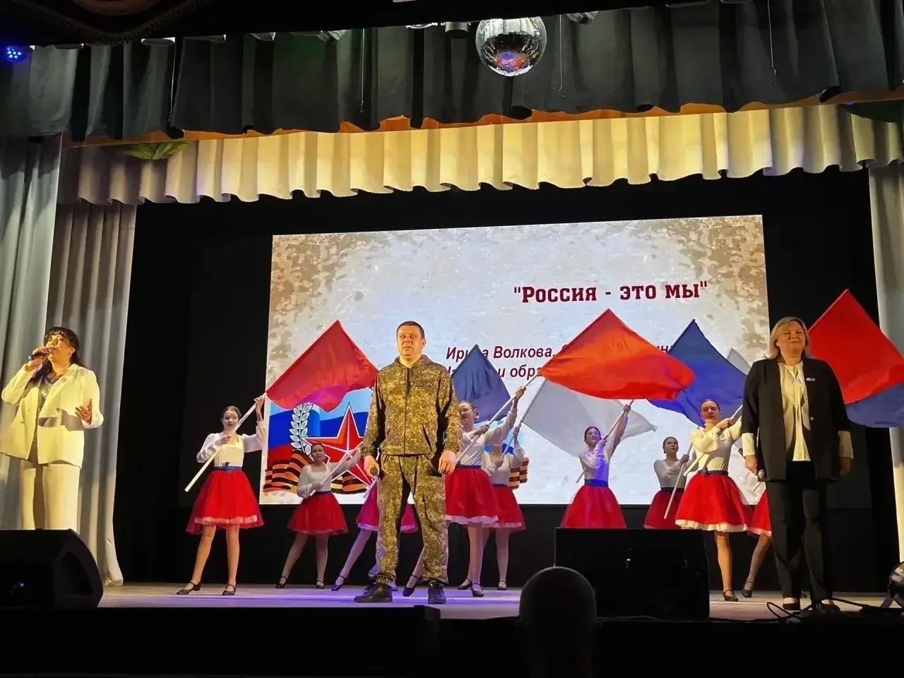 Праздничный концерт начался с яркой вокально-хореографической композиции «Россия – это мы» в исполнении И. Волковой, О. Баранниковой, И. Наумова и танцевального коллектива «Росиночка».